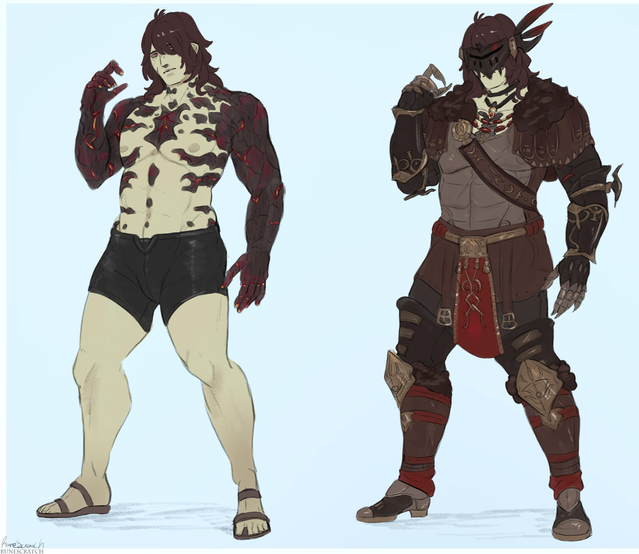 Two separate encounters with the primal Ifrit has led to extensive transformative scarring that Rhylsoemr does his best to hide. Volcanic stone-like scales now cover every inch of his arms and shoulders, and creep into his chest, back, and up his neck like claws seeking to wrench him back into the Lord of the Inferno's embrace. Thanks to a daily enchantment and molybdenum gauntlets, the fire hazard these scales pose has been reduced - enough that he simply seems to radiate more body heat than most people. What are they like without this safeguarding enchantment? Very few people have witnessed it, and Rhylsoemr's is keen to not add to the list.