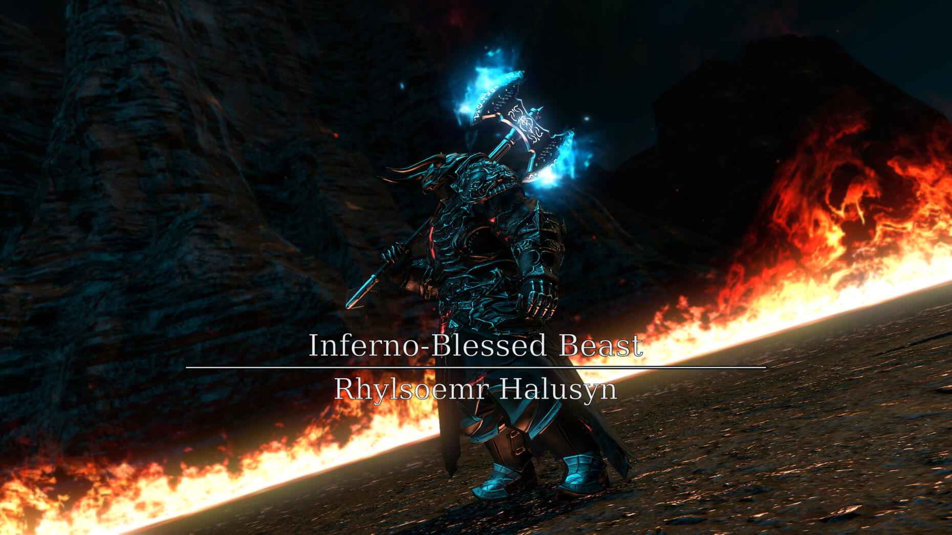 To say that Rhylsoemr is a strong, independent man is an understatement. Years of living off the land and taking hunting jobs for gil have made him an adept survivalist and combatant, and if a situation were to involve him that he doesn't have the knowledge for...well, strength goes far in Hydaelyn. Rare is it when he isn't spotted near one of his weapons - his original wicked guisarme, or his gifted Eastern naginata - and these calloused hands are well-adept in handling them in even the most dire situation. With aggressive strikes and seemingly unending stamina, it seems his goal is not to just beat the enemy, but to brutalize them. However, to those trained in the art of the lancer, a keen eye might spy that this Roegadyn likely was self-taught at first, then received official training much later in life. They're small tells: an attacking stance that starts stiff, only to relax a beat later; an odd grip on weaponshafts that quickly adjusts to optimal; the small reminders to himself to charge his swings and stabs with aether, even when his reserves are plentiful, to name a few. Though few and far between, many of his mistakes are reminiscent of novice transitioning into proper mastery, and from even further back, someone who once used an axe instead of a spear.And yet, for all his size, strength, reach, and aggression, he's a paradoxically hard target to hit. His large lances allow him to strike out of reach of most melee weapons, and he thrives in this distance; rarely will he step any closer than is absolutely necessary, even if the goal is total annihilation of the enemy. And for the times when getting close and personal are necessary to survival, Rhylsoemr is oddly evasive, ducking and weaving every which way to avoid even the faintest scratch or bruise. Of course, his technique isn't infallible; his scars and regular injuries tell tales of his failures. Why does he do this, then, when injury is inevitable? It almost reeks of desperation.With his newfound transformation via Infernal aether, and without his magical and physical containment measures, Rhylsoemr has become both a danger to himself and everyone - and everything - around him. How will he continue living a normal life? One would-be mentor has a potential solution: teaching Rhylsoemr the ways of arcanima, so that he can learn to cast spells and manipulate his own primal-corrupted aether. And since he was present for Ifrit's death...does that not make him a prime candidate for Summoner teaching? Perhaps in the future, he'll be able to fling globs of lava at his enemies, enchant his weapons with infernal fire, or even summon an Ifrit-Egi...